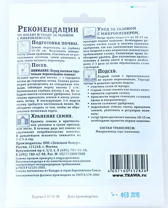 Микроклевер отлично переносит низкое скашивание, при посеве с другими газонными травами обеспечивает газону зеленый цвет в течение всего года.