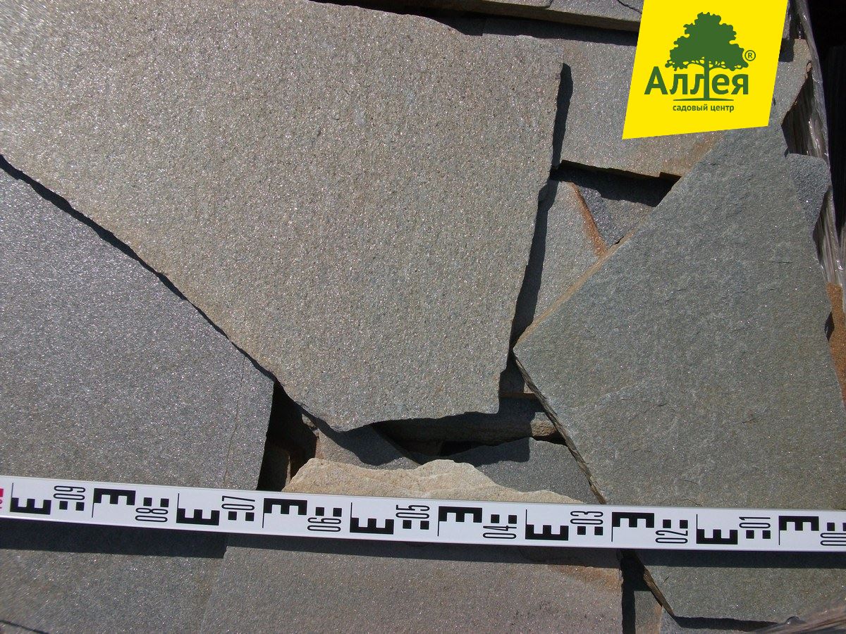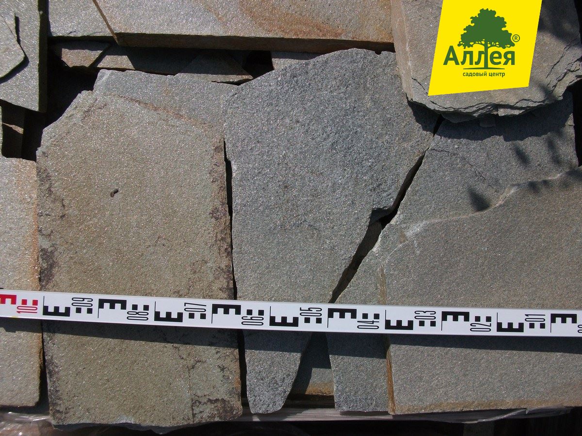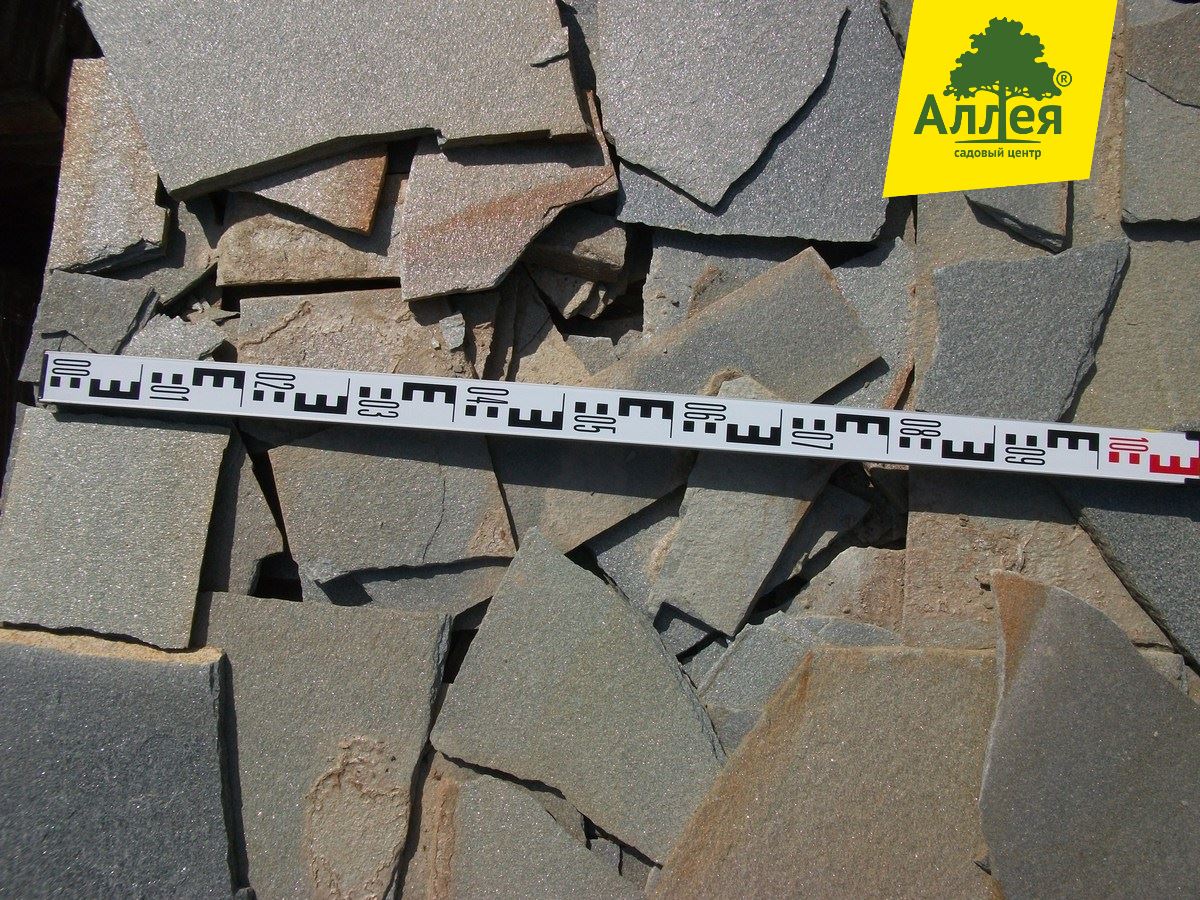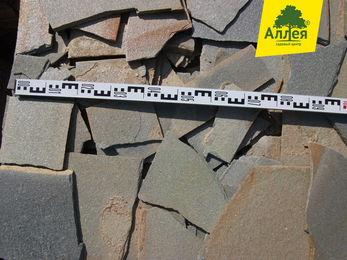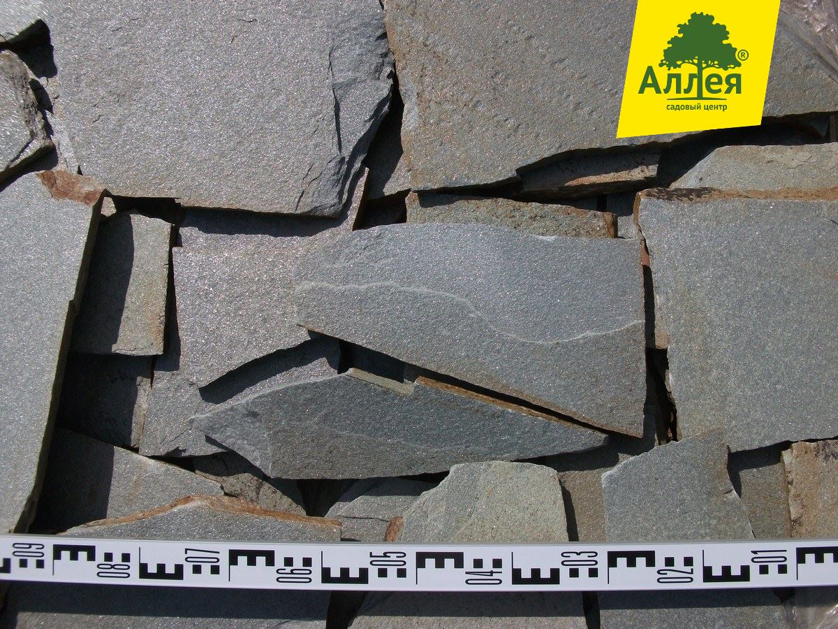 Камень ровный, плоский, размер плит средний от 20-30 см. Серо-голубой, сильно-серебристый.