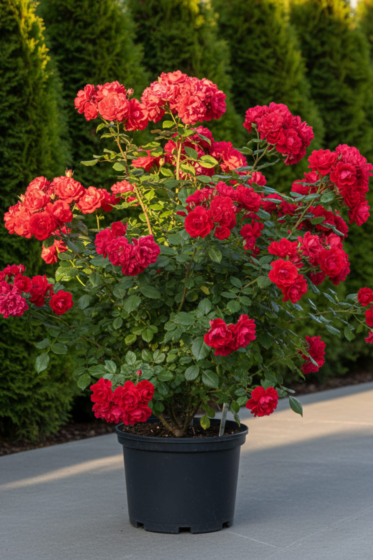 - махровые, чашевидной формы, средние 6-7 см в диаметре, интенсивно-красного цвета, с нежным ароматом, в соцветиях до 10 цветков.
